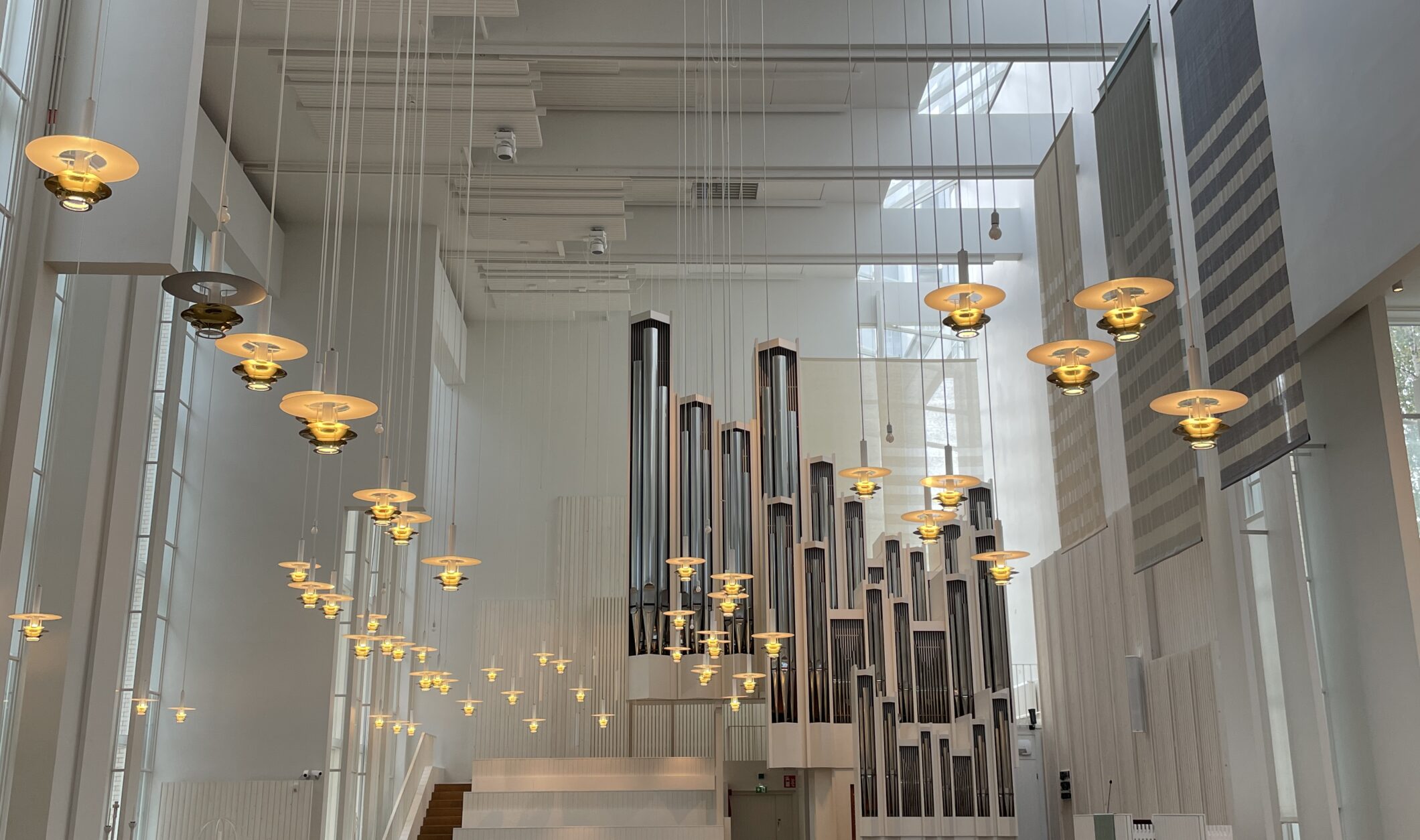 しかし中に足を踏み入れると、天井から壁へと自然光がやわらかく広がり、白い壁に反射して空間全体が淡い光に包まれます。アールト独特の曲線を描く天井や木のベンチは、どこか懐かしく温かい雰囲気で、祈りの場に相応しい静謐さが漂っていました。