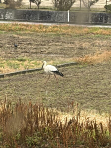 先日、家の窓から外をふと眺めると、田んぼにコウノトリが舞い降りました。