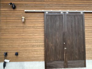 事務所の倉庫は木板を横張りで張っています。